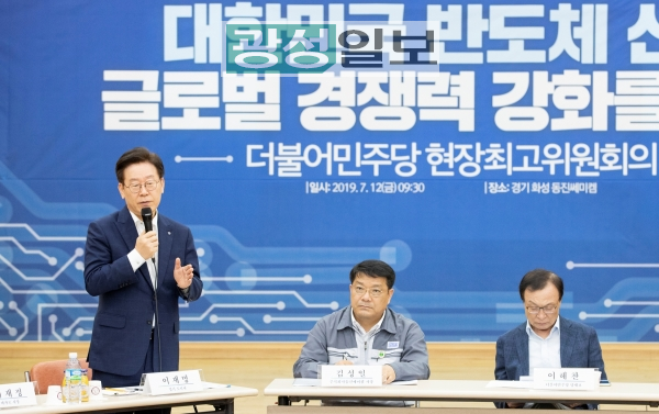 이재명 경기도지사가 일본의 경제보복에 대해 오만함의 반증이라며 이번 기회로 정부와 대기업, 중소기업이 협력해 안정적 공급체계를 만들어야 한다고 강조했다.이재명 지사는 12일 화성에 있는 반도체 소재기업에서 열린 더불어민주당 현장 최고위원회에서 이같이 말하면서 “경기도는 현재 실태조사, TF팀 구성, 긴급자금지원 등 긴급대책을 수립하고 있는데 장기적으로 안정적 공급 체계를 만드는 데 적극 노력하겠다”고 말했다.