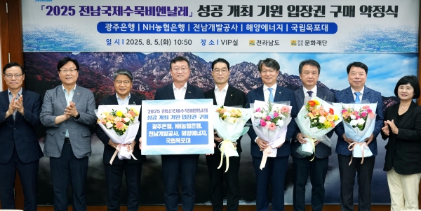 [광성일보] 전남문화재단(전남국제수묵비엔날레사무국)은 5일 전남도청 VIP실에서 지역 주요 기업, 대학 등과 2025 전남국제수묵비엔날레 성공개최를 위한 입장권 구매약정식을 개최했다고 밝혔다.약정식에는 김종훈 광주은행 부행장, 류종필 NH농협은행 전남본부장, 장충모 전남개발공사 사장, 정회 해양에너지 대표이사, 박시형 국립목포대학교 교학부총장 등 5개 기관 관계자 10여 명이 참석해 총 8천500만 원 상당의 입장권 구매를 약정했다.구매된 입장권은 임직원 복지, 고객 환원, 지역 소외계층 지원 등 다양한 방식으로 활용할 계획이다.