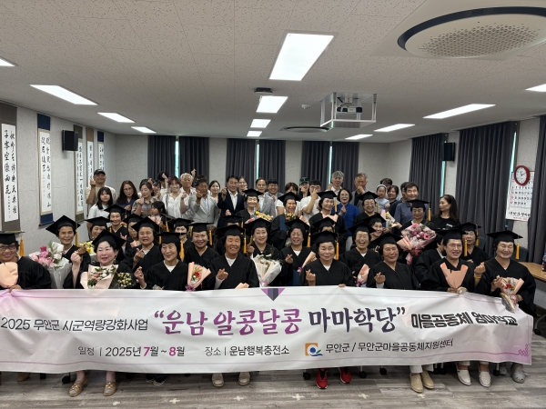[광성일보] 전남 무안군(군수 김산) 지난 2일 운남 행복충전소에서 무안군 마을공동체 엄마학교 ‘운남 알콩달콩 마마학당’ 졸업식을 마쳤다.이날 졸업식은 졸업생인 마마학당 학생들 30명과 가족들, 지역주민 등 80여명이 참석한 가운데, 무안군 김병중 부군수를 비롯한 지역 관계자들도 자리해 어머니들의 활동과 배움에 진심 어린 축하를 보냈다.따뜻한 분위기 속에서 시작된 행사는 마마학당 어머니들이 직접 준비한‘고향의 봄’과‘운남의 찬가’합창공연, 졸업장과 부문별 상장 수여, 가족 편지 낭독,‘어머님의 은혜’제창 순으로 진행됐다.