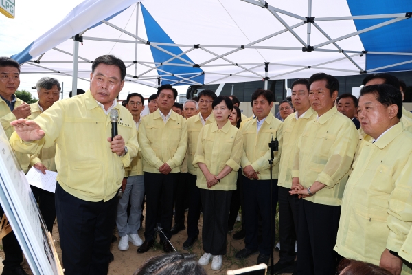 무안군은 지난 3일부터 4일 새벽까지 이어진 시간당 131mm의 기록적인 집중호우로 인해 소하천 범람, 도로 유실, 공공시설 침수 등 곳곳에서 피해가 발생했으며, 무안읍에는 주택 침수로 인해 25세대 주민이 긴급 대피하기도 했다.이날 현장 최고위원회에는 더불어민주당 정청래 대표, 서삼석 최고위원을 비롯한 지도부 등 16명이 대거 참석했으며, 현장 브리핑에서 김산 군수는 폭우 시 통수단면 부족으로 하천 범람과 무안읍 저지대 상습침수의 원인이 되는 송촌교 재가설과 무안천 하류구간 하천 정비사업을 건의했다.