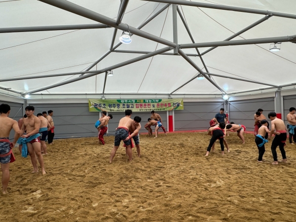 [광성일보] 광주시청 직장운동경기부 씨름팀이 지역 내 초·중·고 씨름 꿈나무들을 대상으로 특별 재능기부 훈련을 열었다.이번 행사는 지난 8일 광주초월생활체육공원 씨름 훈련장에서 진행됐다. 광주초등학교 씨름부 8명, 광주중학교 씨름부 10명, 초월고등학교 씨름부 8명을 비롯해 지도자, 직장운동경기부 씨름팀, 광주시체육회 관계자 등 40여 명이 참가해 훈련장을 가득 메웠다.