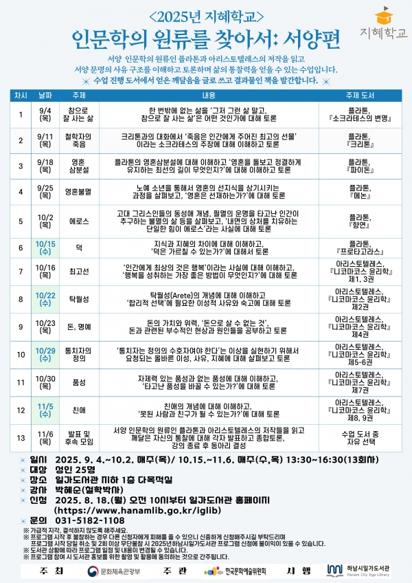 이번에 개설되는 강의는 ‘인문학의 원류를 찾아서: 서양편’으로, 박혜순 서강대학교 철학연구소 책임연구원이 진행한다. 수강생들은 플라톤과 아리스토텔레스의 주요 저작을 중심으로 삶과 죽음, 덕, 정의 등 인문학의 근본 주제를 탐구하며 토론을 이어간다. 강의는 단순한 지식 전달을 넘어, 사유를 글로 정리하고 이를 책으로 엮는 방식으로 마무리된다. 강연 종료 후에도 자율적인 독서 동아리 활동으로 고전 읽기 문화를 확산시킬 예정이다.강의는 9월 4일부터 10월 2일까지 매주 목요일, 10월 15일부터 11월 6일까지 매주 수·목요일 13시 30분부터 3시간 총 13회차로 운영되며 프로그램 신청은 하남시일가도서관 홈페이지(https://www.hanamlib.go.kr/iglib)에서 할 수 있다.