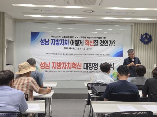 [광성일보] 사회대개혁 지방자치혁신 성남시민행동(이하 ‘성남시민행동’)이 8월 26일 저녁 7시, 주민신협 커뮤니티 회의실에서 ”성남 지방자치 어떻게 혁신할 것인가?“라는 주제로 지방자치아카데미 1강이 윤석인 희망제작소 이사장 강연으로 진행됐다.이날 강연에서 윤 이사장은 지방자치의 개념과 우리나라 지방자치 역사 그리고 민선 5~7기 주요 자치혁신 사례들을 소개했다. 특히 ‘지방자치3.0으로 나아가는 길’의 대목에서 ▲읍.면.동 주민자치와 기관구성 다양화 ▲기초.광역 부단체장 인사권 독립 ▲정당공천제 폐지 ▲자치분권형 개헌을 제안해 눈길을 끌었다.‘성남시 지방자치 혁신을 위하여’를 설명하면서 민선 5기 6기 이재명 시장의 ‘시정 혁신’으로 2010년 모라토리엄 선언과 예산 재편성, 3대 무상복지(청년배당 무상교복 산후조리지원), 기본소득(국제심포지엄 등 개최), 지역화폐와 시민기업, 성남시립의료원 건립 성과가 있었지만, 주민참여 주민자치(마을만들기 등)와 시민사회 거버넌스 등에는 소극적이었다고 지적했다.