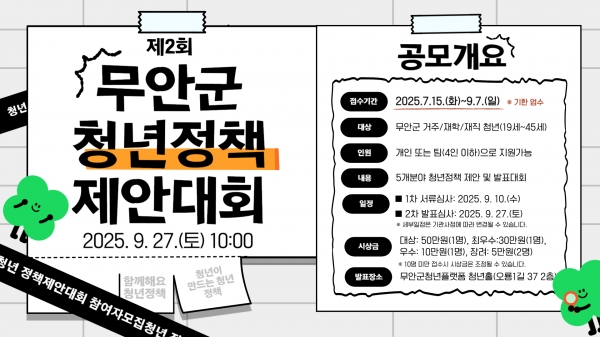 아울러 청중 참여 이벤트도 함께 열린다. 8월 18일(월)부터 9월 19일(금)까지 무안군청년플랫폼 홈페이지에서 신청할 수 있으며, 참여자는 이벤트 URL에 접속해‘대회 청중 신청 인증샷’과 함께‘내가 바라는 청년정책’을 작성하면 된다. 이벤트 참가자에게는 무안군청년플랫폼 굿즈 세트가 제공된다.김상준 센터장은 “정책제안대회는 청년이 직접 목소리를 내고, 그 제안이 지역사회 안에서 논의되는 소중한 기회”라며, “청년들의 다양한 아이디어가 서로에게 영감을 주고 지역 변화를 만들어내는 밑거름이 되길 바란다”고 전했다.