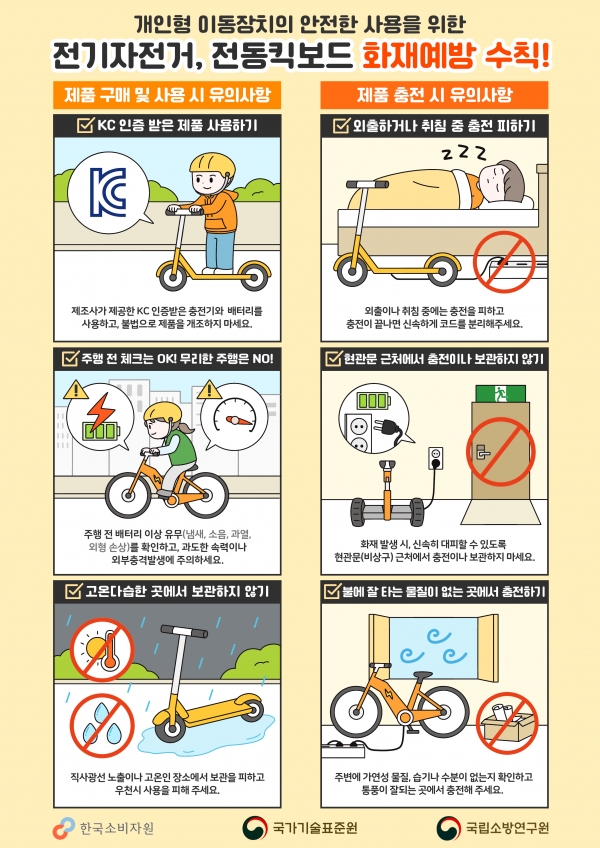 소방서에 따르면 개인형 이동장치(Personal Mobility)제품 사용 시 반드시 KC인증을 받은 전기자전거와 전동킥보드를 사용하고 제조사가 제공한 정품 충전기와 배터리를 사용하는 것이 중요하다.불법 개조는 안전사고의 주요 원인이 되는 만큼 절대 삼가야 한다. 또한 주행 전 배터리 이상 유무(냄새, 소음, 과열, 외형 손상 등)를 반드시 확인하고 직사광선이나 고온 장소에 보관하거나 우천 시 사용하는 것을 피해야 하며 외부 충격 발생에도 주의해야 한다.