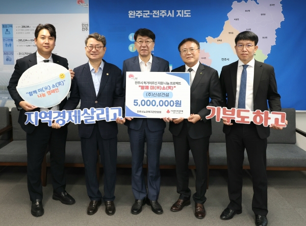 이날 ㈜신성건설 임직원들은 나눔 문화 확산을 위한 프로젝트에 적극 동참하겠다는 의지를 담아 모은 현금 500만 원을 전주시에 전달했다. 전달된 기부금은 전주지역 7개 노인복지관에서 모금된 기부금과 함께 돌봄이 필요한 독거노인에게 백미와 누룽지, 식료품 등의 꾸러미로 전달될 예정이다. 앞서 시와 전주시노인복지관연합회는 지난 7월 28일부터 전주지역 독거노인 지원을 위한 나눔프로젝트인 ‘함께미(米)소(笑)’ 프로젝트를 추진해 왔다. 이 프로젝트는 정부가 추진 중인 민생소비쿠폰을 활용해 개인이 받은 민생소비쿠폰의 10%를 기부하는 방식으로 시작됐다. 시는 현재 독거노인 지원을 위한 나눔 프로젝트로 확대해 1억 원의 모금액을 모집해 돌봄이 필요한 독거어르신 1만 명을 지원하는 것을 목표로 추진하고 있으며, 8월 말 기준으로 약 1달 만에 2600여만 원의 후원 물품과 후원금이 모집된 것으로 집계됐다.