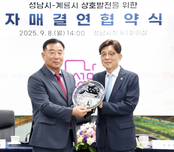 이날 협약식은 양 도시 간의 상생과 우호 교류를 다짐하는 자리로, 협약서 낭독을 비롯해 성남시장 환영사, 계룡시장 답사, 양 시 의회 대표들의 축사, 기념품 교환 등의 순서로 진행됐다