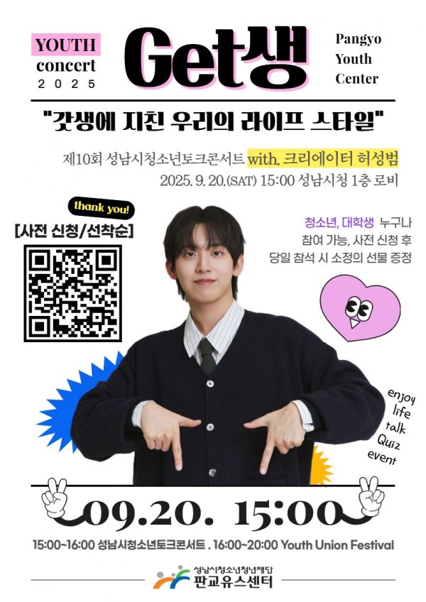 성남시청소년토크콘서트는 [갓생에 지친 우리의 새로운 라이프 스타일‘Get생’]을 주제로 청소년과 청년들에게 높은 인기를 얻고 있는 크리에이터 허성범과 함께 자유롭고 편안한 분위기 속에서 진행될 예정이다.주요 프로그램으로는 청소년과 청년들의 눈높이에서 공감하고 소통할 수 있는 주제의 이야기와 랜덤Q&A 등이 준비됐으며, 사전 신청을 통해 행사에 참여한 이들에게는 소정의 선물도 제공된다. 신청은 9월 17일까지 온라인으로 가능하며, 선착순으로 마감된다.