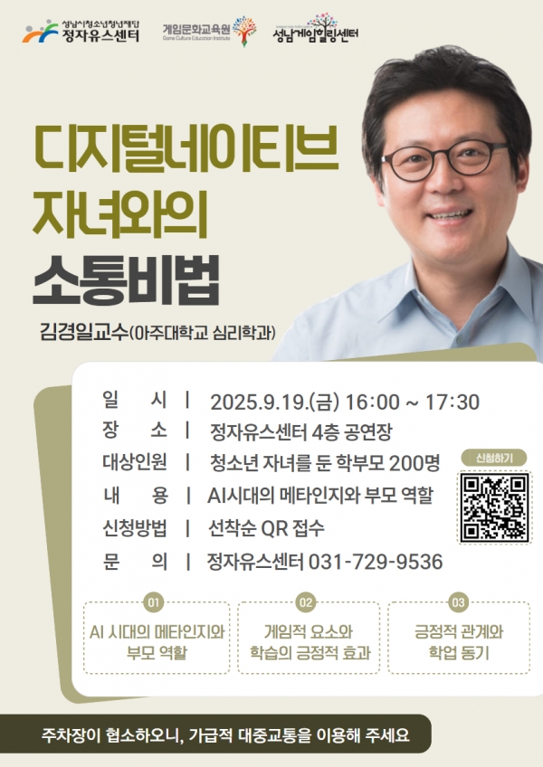 [광성일보] 성남시청소년청년재단(대표이사 양경석) 정자유스센터는 오는 19일(금), 김경일 교수(아주대학교 심리학과)의‘디지털네이티브 자녀와의 소통비법’부모 특강을 정자유스센터 공연장에서 진행한다고 밝혔다.이번 특강은 빠르게 변화하는 디지털·AI 시대에 청소년이 가진 특성을 이해하고, 게임 등 디지털 문화 속 긍정적 요소를 발견하여 자녀와의 소통 방법을 배우는 자리로 청소년 자녀를 둔 부모라면 누구나 참여 가능하다.