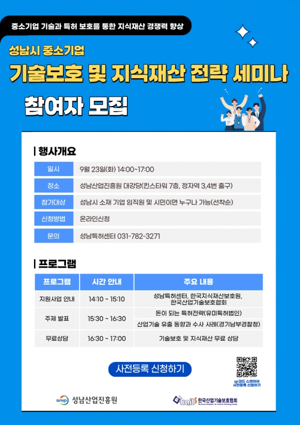 이번 행사는 지난해 3월 성남시·한국산업기술보호협회·성남산업진흥원이 체결한 ‘성남시 중소기업 산업기술보호 협력체계 구축’ 업무협약 이후 두 번째 공식 행사다.성남시는 올해도 중소기업의 기술 유출 방지와 핵심기술 보호를 위해 보안 진단, 컨설팅 등 다양한 지원 사업을 추진하고 있다.또한 세미나 종료 후 대강당 로비에서는 지식재산, 기술보호, 영업비밀보호 등 분야별 전문가와 1:1 상담 부대행사가 진행된다.이의준 성남산업진흥원 원장은 “이번 세미나와 기술보안 진단·컨설팅 지원사업을 통해 중소기업이 기술 유출을 예방하는 좋은 계기가 되길 바란다”고 밝혔다.참여 신청은 성남산업진흥원 홈페이지를 통해 온라인으로 접수 가능하며, 문의는 성남특허센터(031-782-3271~2)로 하면 된다.