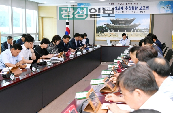광주시는 지난 24일 시청 상황실에서 신동헌 시장을 비롯한 부시장, 국·소장, 실·과장 등 관계 공무원 50여명이 참석한 가운데 ‘민선7기 2019년도 시정과제(공약)추진현황 보고회’를 개최했다.