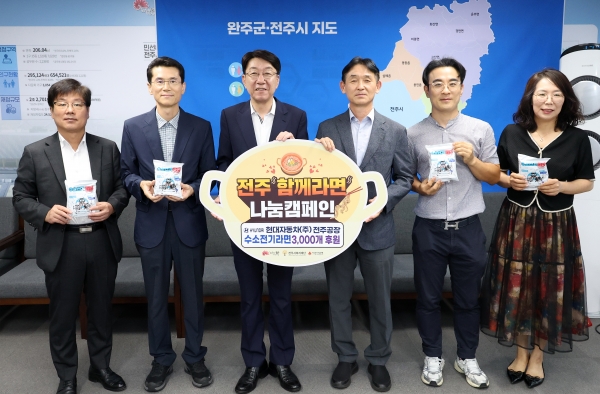 현대차 전주공장은 사업 취지에 깊이 공감해 후원을 결정했으며, 이번에 전달된 수소전기라면은 현대차가 미래형 친환경 상용차인 수소전기버스와 수소전기트럭을 알리기 위한 홍보 차원에서 자체 제작한 제품이다. 장현구 현대자동차 공장장은 “지역사회와 함께 성장하는 것이 현대차의 목표”라며 “앞으로도 지역 주민들의 따뜻한 일상을 위해 다양한 사회공헌 활동을 이어 가겠다”고 밝혔다. 우범기 전주시장은 “한가위를 앞두고 지역 대표기업에서 따뜻한 나눔을 실천해주셔서 감사드린다”면서 “기부해 주신 물품은 어려운 이웃들을 위해 소중히 사용하겠다”고 말했다.