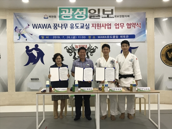 분당구 백현동행정복지센터(동장 양정민)는 지난 26일 오전 11시 양정민 백현동장, 신명자 지역사회보장협의체 민간위원장, 조준현 WAWA유도클럽 관장 등이 참석한 가운데 「WAWA 꿈나무 유도교실」지원 사업을 위한 업무 협약을 체결했다.