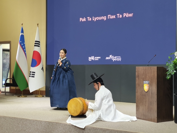 지난 25일 저녁에는 주우즈베키스탄 대한민국대사관이 주최한 국경일 리셉션 무대에 전주 판소리 합창단이 올라 「흥보가」, 「신뱃노래」, 기악 합주 등을 선보였다. 현지 장·차관 등 주요 인사 400여 명이 참석한 가운데 뜨거운 박수가 쏟아졌다..현지 참석자들은 “판소리와 한지를 직접 경험하며 전북 문화를 생생하게 느낄 수 있었다”, “이번 프로그램이 전북을 새롭게 알게 되는 계기가 됐다”라며 높은 만족감을 드러냈다.백경태 전북도 대외국제소통국장은 “이번 프로그램은 단순한 공연을 넘어 전북의 문화와 교육을 현지 시민과 공유하고, 상호 신뢰를 키우는 계기가 됐다”며 “앞으로도 전북은 문화교류를 지속적으로 이어가겠다”고 말했다.