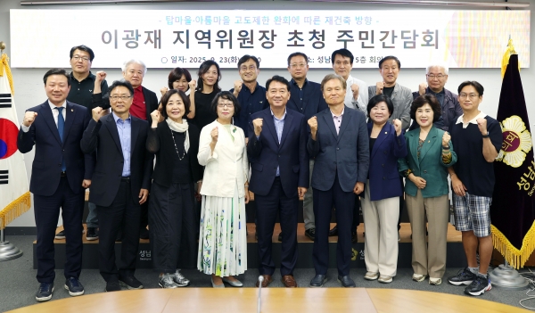 [광성일보] 성남시의회 더불어민주당협의회는 23일 성남시의회 5층 회의실에서 이광재 분당갑 지역위원장을 초청해 탑마을·아름마을 주민간담회를 개최했다. 이번 간담회에서는 최근 결정된 서울공항 고도제한 완화의 구체적인 내용과 이에 따른 재건축 추진 방향에 대해 주민들이 직접 설명을 듣고 의견을 나누는 자리가 마련되었다.