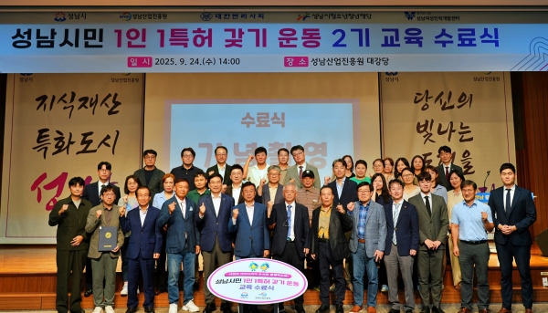 [광성일보] 성남산업진흥원(원장 이의준)은 9월 24일(수) 대강당에서 『성남시민 1인 1특허 갖기 운동』 제2기 교육 수료식을 개최하고, 시민 지식재산 역량 강화의 성과를 공유했다.『성남시민 1인 1특허 갖기 운동』은 2025년부터 추진 중인 시민 참여형 지식재산 교육 프로그램으로, 아이디어를 특허로 발전시키고 창업 등 실질적 활용으로 이어지도록 기초 역량을 키우는 데 목적이 있다. 상반기 1기 교육에 이어 하반기 2기 교육까지 연속 운영되며 시민들의 높은 관심과 성과를 이끌어냈다.