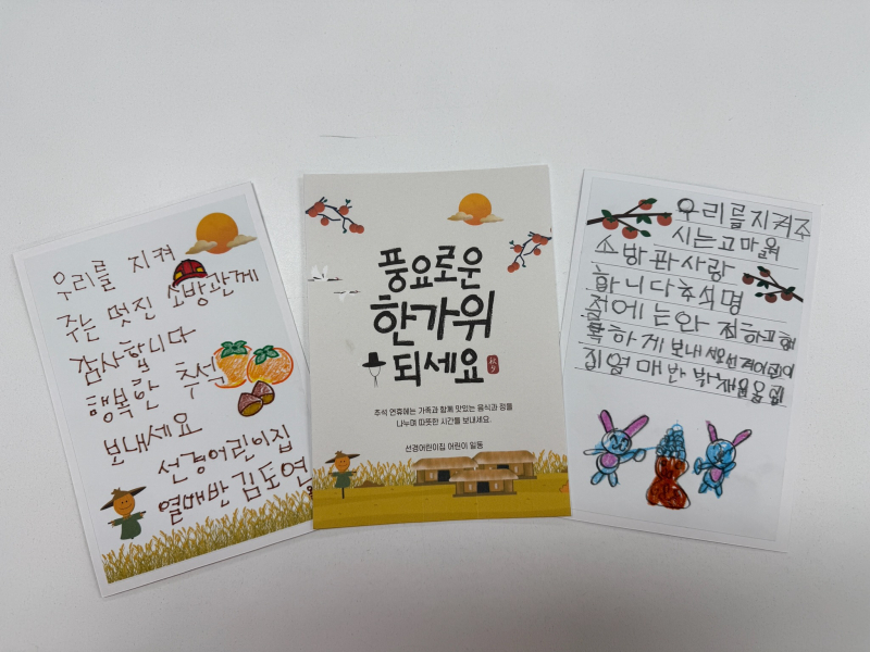 [광성일보] 성남소방서는 최근 성남시 중원구 상대원동에 있는 선경 어린이집 친구들이 추석을 맞아 감사의 마음이 담긴 손편지를 전해받았다고 30일 밝혔다.이번 감사편지는 2025년 한국119청소년단으로 활동하고 있는 선경어린이집 친구들이 다가오는 추석 명절을 앞두고 시민의 안전을 위해 애쓰는 소방관들에게 응원의 메시지를 전달하고자 정성껏 준비한 것이다.