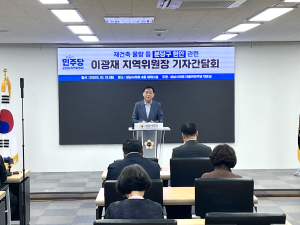 [광성일보] 이광재 더불어민주당 분당갑 지역위원장은 13일 성남시의회 4층 세미나실에서 기자간담회를 열며 “분당은 1기 신도시 중에서도 상징성이 큰 도시로, 주민 삶의 질과 도시의 지속가능성을 위해 정부와 지자체가 함께 적극적으로 나서야 한다”고 밝혔다.