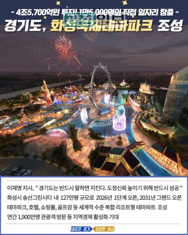 이재명 도지사는 이날 “10년 동안이나 투자자를 찾지 못해 계속 표류했었는데 (여러분들이) 큰 결단을 내려 문제를 해결했다”라며 “경기도는 반드시 말하면 지킨다. 도정에 대한 신뢰를 높이기 위해서라도 반드시 성공해야 한다”라고 강조했다.이 지사는 이어 “여러 산업 영역 중 관광 산업과 콘텐츠 산업이 중요하다. 경기도에서도 유일하게 성장, 발전하는 분야”라며 “시간이 돈이다. 최대한 신속하게 사업이 진행될 수 있도록 각별히 신경 쓰겠다”라고 말했다.