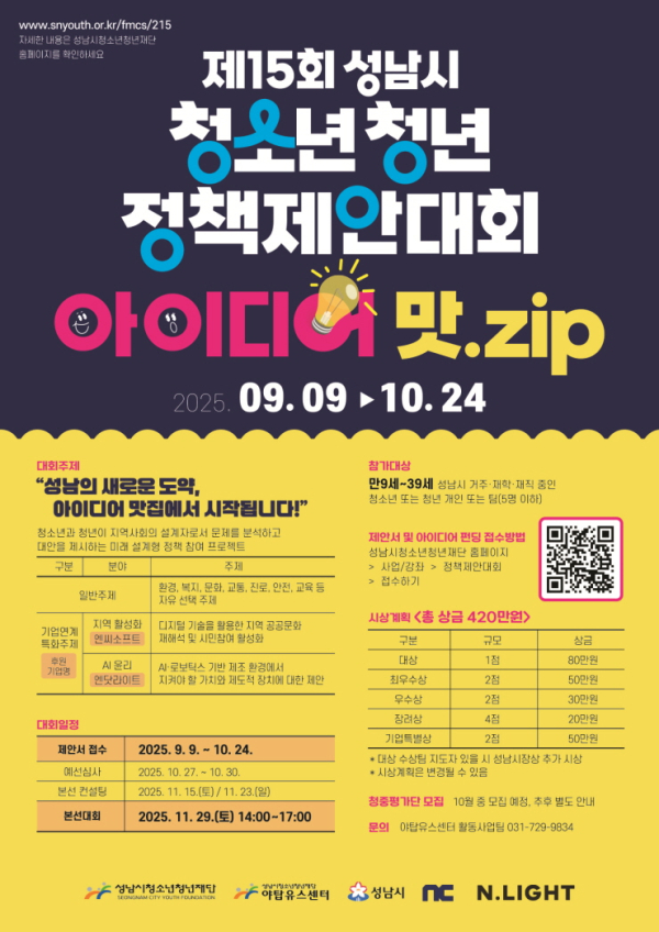 성남시청소년청년정책제안대회는 지난 2011년 시작된 이래 올해로 15회를 맞이하며, 청소년과 청년의 사회 참여 문화를 확산하기 위해 추진됐다. 만 9세부터 39세까지 개인 또는 5인 이내 팀으로 참여할 수 있으며, 자유주제의 일반부문과 기업연계 주제의 특화부문으로 나눠 운영된다.일반부문은 환경, 복지, 문화, 교통, 진로, 안전, 교육 등 지역 사회 전반의 문제를 주제로 한다. 특화부문은 후원기업인 엔씨소프트와 엔닷라이트의 기업 특성을 반영해 청소년·청년의 창의성과 실현 가능성을 중점적으로 평가할 계획이다. 최종 수상자에게는 대상, 최우수상, 우수상, 장려상, 기업특별상이 수여되며 총상금은 420만 원 규모다.