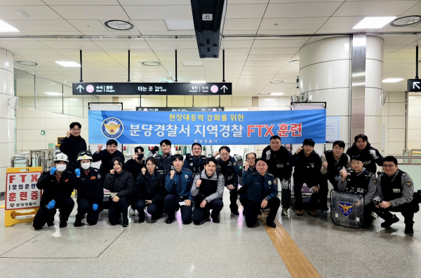 분당경찰서는 지난 8월 FTX 훈련에 이어 이달 27일 ‘현장경찰관 안전 확보’를 위한 FTX(현장대응훈련)를 실시한다고 8일 밝혔다. 참여대상은 112상황팀을 비롯해 6개 지구대ㆍ파출소, 형사과, 경비교통과(교통외근), GTX-A 성남역, 분당소방서 등이 참여하는 이번 훈련은 ‘지하철 역사 내 흉기난동’ 주제로 진행된다.◦ 훈련 방식은 가상의 상황을 설정해 112신고시스템을 통해 전파하고, 관할 지구대 및 파출소 경찰관들의 현장출동을 유도하는 식으로 이뤄진다. 112상황팀 및 현장에 출동한 경찰관은 실제 상황을 가정해 현장 조치에 나서게 된다.