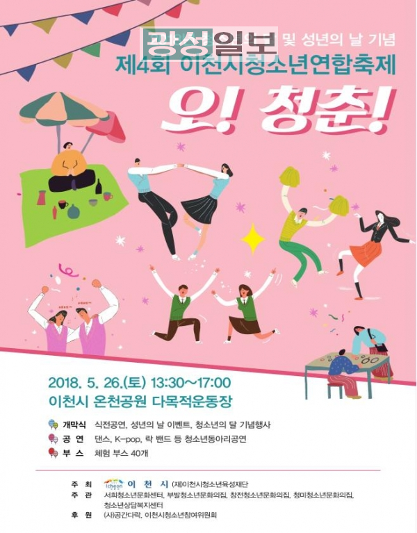 이천시(시장 조병돈)가 주최하는 <2018년 청소년의 달 및 성년의 날 기념> 제4회 이천시 청소년연합축제(이하 ‘축제’) “오! 청춘” 이 5월 26일 오후 1시 30분부터 리와 먹을거이천시 온천공원 다목적 운동장에서 다양한 볼거리, 즐길 거리를 제공하며 성대히 개최된다.