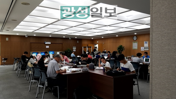 성남시(시장 은수미)가 시민 개방시설로 운영 중인 시청 9층 하늘북 카페가 인기다.에어컨 바람이 시원한 곳에서 책(book)을 읽으면서 여름휴가(vacance)를 즐기려는 이른바 ‘북캉스 족’이 최근 하루 평균 400명 이곳을 찾고 있다.시청 9층 하늘북 카페는 1만6096권의 도서와 잡지 68종, 신문 17종이 비치된 시민 독서문화 공간이다.