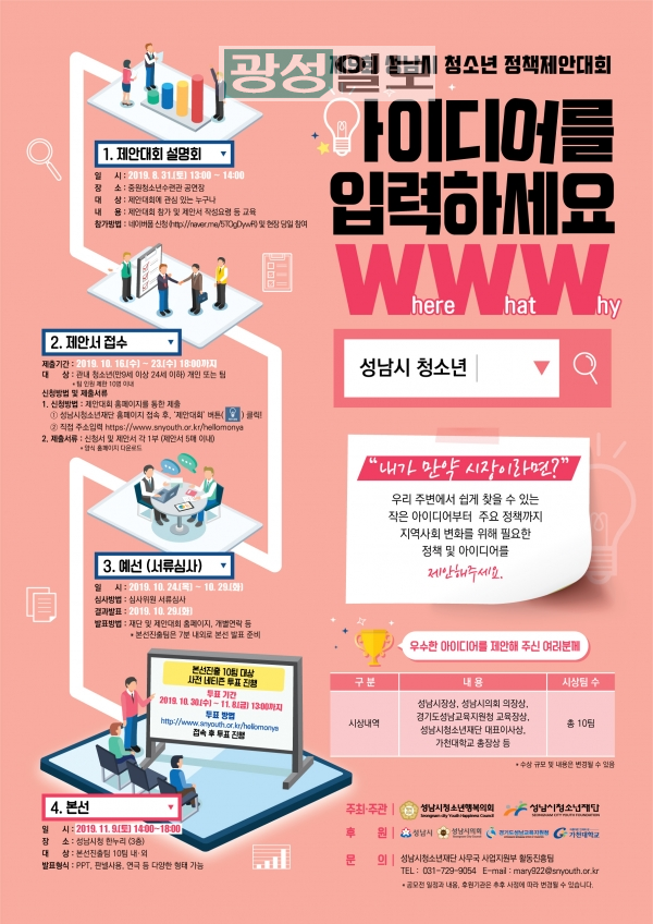 성남시청소년행복의회와 성남시청소년재단이 주최하고 성남시, 성남시의회, 경기도성남교육지원청, 가천대학교가 후원하는 제9회 성남시 청소년 정책제안대회 ‘아이디어를 입력하세요 WWW’는 성남시 관내 청소년(만9세 이상 24세 이하) 개인 또는 팀이 지역사회 변화를 위해 필요한 정책 및 아이디어를 자유롭게 제안하는 대회로 오는 11월 9일 성남시청 한누리에서 본선대회가 열린다.