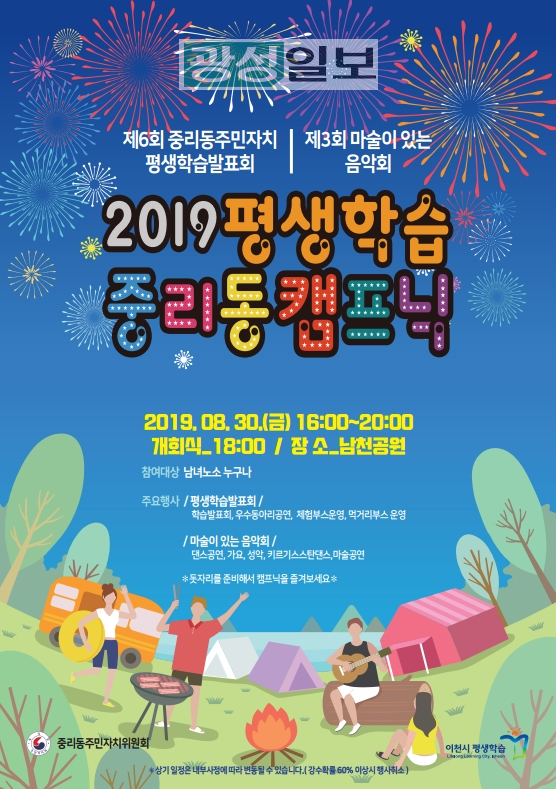 이천시 중리동주민자치위원회는 30일 제6회 중리동평생학습발표회 2019평생학습 중리동캠프닉과 제3회 마술이 있는 음악회(달빛소리 작은 음악회)를 남천공원에서 오후 4시부터 오후 8시까지 개최한다. 개막식은 오후 6시에 진행된다.