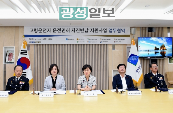 이화순 경기도 행정2부지사와 문경희 경기도의원, 최용덕 경기도시장군수협의회 사무총장, 박생수 경기남부지방경찰청 1부장, 박명춘 경기북부지방경찰청 2부장, 김덕섭 도로교통공단 운전면허본부장, 이중재 한국교통안전공단 경기북부본부장, 최종국 대한노인회 경기도연합회 사무처장, 김성훈 손해보험협회 중부지역본부장은 29일 오전 경기도청 북부청사 상황실에서 이 같은 내용의 ‘고령운전자 운전면허 자진반납 지원사업 업무협약’을 체결했다.