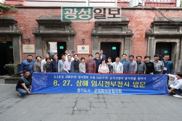 경기도 시‧군의회의장협의회(회장 박문석)는 지난 8월 27일부터 5박 6일간의 항일운동유적지 방문을 마치고 9월 1일 귀국했다.이번 방문은 독립운동 선열들의 유지를 받들어 국가발전과 대국민 화합을 위한 경기도 시‧군의회 의장들의 선도적인 역할을 위해 마련됐다.