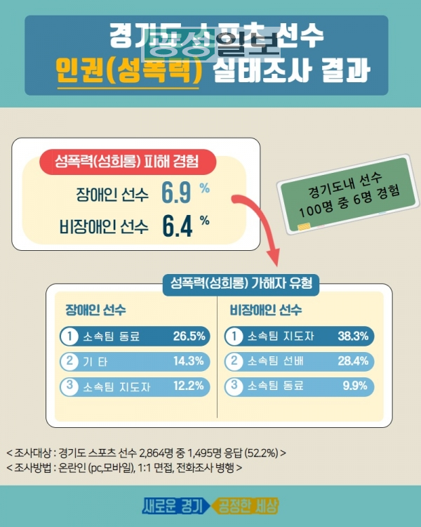 이어 도는 지난 4월 22일부터 6월 21일까지 경기도가족여성연구원이 ㈜케이스탯리서치에 의뢰해 도내 체육단체 소속 선수와 대학·장애인 선수 등 2,864명을 대상으로 온라인 설문조사를 진행했다. 장애인 선수들의 경우 장애유형에 따라 온라인(PC, 모바일), 1:1 면접, 전화조사 등을 병행했다.