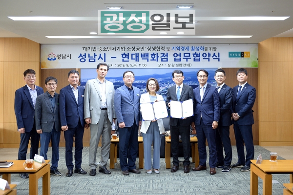 성남시는 9월 5일 오전 11시 시청 9층 상황실에서 은수미 성남시장과 박동운 현대백화점 대표이사 등이 참석한 가운데 ‘대기업-중소벤처기업-소상공인 간 상생 협력과 지역경제 활성화를 위한 업무 협약’을 했다.