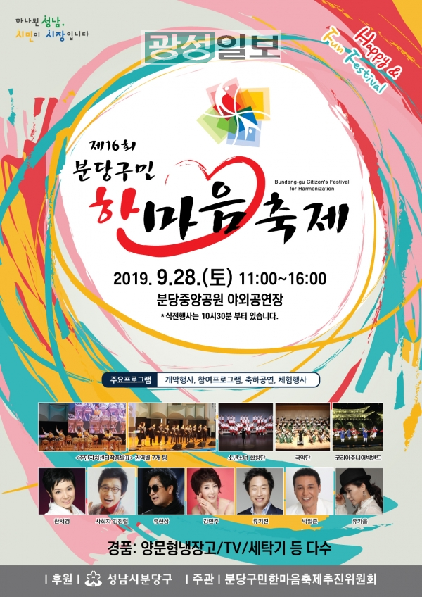 성남시 분당구는 풍성한 가을을 맞이하여 오는 9월 28일(토) “제16회 분당구민 한마음 축제“를 중앙공원 야외공연장에서 개최할 예정이다.분당구민 한마음축제 추진위원회(위원장 장동석) 주최로 『Happy & Fun Festival』을 모토로 진행될 이번 축제의 개막은 참여구민과 내빈 모두가 하나가 되어 박터뜨리기 포퍼먼스로 축제의 장을 흥겹게 시작한다.
