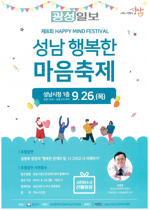 성남시(시장 은수미)는 오는 9월 26일 오전 10시~오후 3시 시청 온누리와 로비에서 행복한 마음축제(옛 성남정신건강축제)를 연다.이날 행사는 정신건강의 날(10.10)을 기념해 정신건강에 대한 관심을 높이고 치료에 관한 긍정적 인식을 확산하기 위해 마련된다.