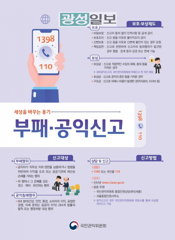 신고대상 부패행위로는 ▲공직자가 직무상 지위·권한을 남용하거나 법령을 위반하여 이익을 도모 또는 공공기관에 재산상 손해를 가하는 행위 ▲ 위 행위나 그 은폐를 강요·권고·제의·유인하는 행위이며, 공익침해행위로는 ▲국민의 6대 분야(건강,안전,환경,소비자의 이익, 공정한 경쟁, 이에 준하는 공공의 이익) 284개 법률의 벌칙 또는 행정처분 대상 행위이며, 부패·공익침해 신고 및 보호·보상 상담은 1398 또는 국민콜 110으로 할 수 있으며, 국민권익위원회 홈페이지 및 청렴포털을 통해 제보할 수 있다.