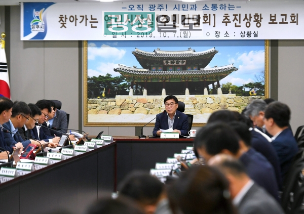 광주시는 7일 시청 상황실에서 신동헌 시장 주재로 ‘찾아가는 열린시장실(주민간담회) 추진상황 보고회’를 개최했다.‘찾아가는 열린시장실(주민간담회)’은 민선7기 출범과 더불어 지역 현안사항 및 주요민원에 대해 시장이 직접 민원현장을 방문해 시민들의 생생한 목소리를 듣고 해결방안을 함께 모색하기 위해 지난 2018년 10월 도척면 도웅리를 시작으로 9월까지 총 28회 실시됐다.
