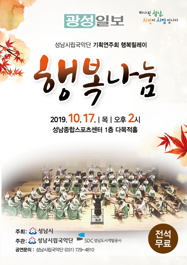 성남시민의 공공 문화 체육시설 등 복합 문화 공간인 성남종합운동장 內 성남종합스포츠센터 1층 다목적 홀에서 특별 무대로 2019년 10월 17일 오후 2시 성남시립국악단 감독 겸 상임지휘자 김만석 지휘로 연주회를 성남도시개발공사와 함께 개최한다.