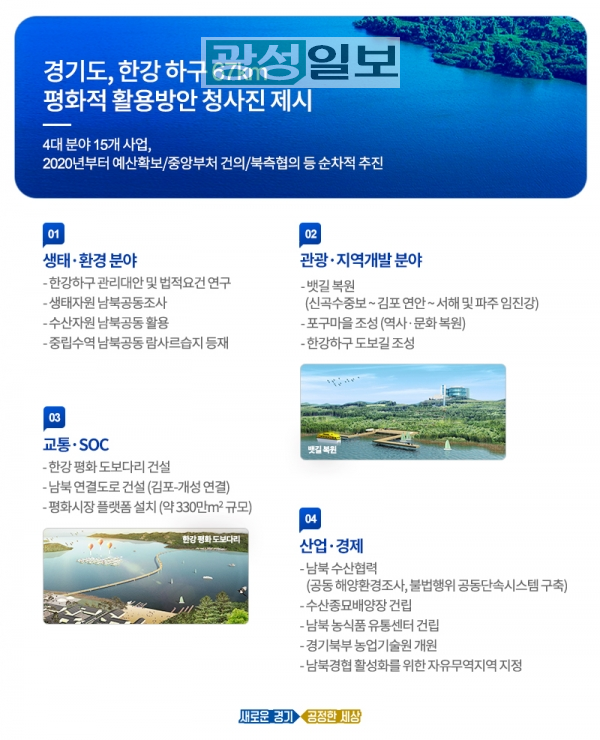 둘째, ‘관광·지역개발’ 분야에는 뱃길(신곡수중보~김포 연안~서해 및 파주 임진강) 복원, 포구마을 조성(역사·문화 복원), 한강하구 도보길 조성 등 3개 사업이 포함됐다.셋째, ‘교통·SOC’ 분야로는 평화 도보다리 건설, 남북 연결도로 건설, 평화시장 플랫폼 설치 등 3개 사업이 제안됐다.