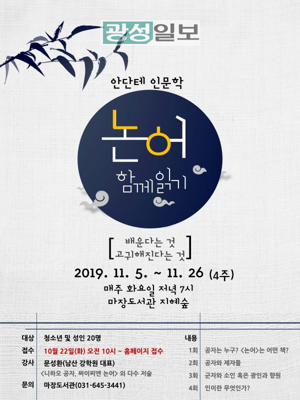 이천 마장도서관에서는 천천히 읽고 깊이 나누는 인문학 강좌인 ‘안단테 인문학’을 연4회 운영하고 있다.봄의 안단테로 사주명리스쿨, 여름의 안단테로 청소년 낭독극 스쿨, 가을의 안단테로 영화 읽어주는 인문학을 운영하였으며 마지막 겨울의 안단테로 ‘논어 함께 읽기’를 운영한다고 밝혔다.