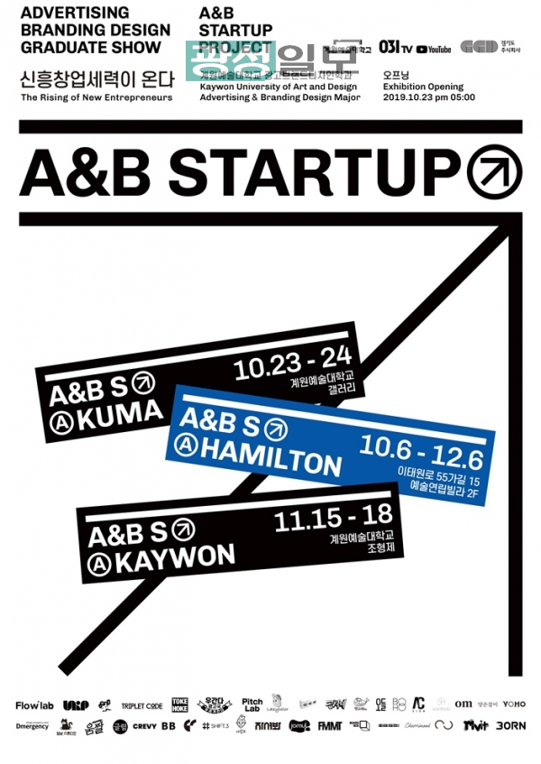 신흥창업세력이 온다: A&B STARTUP’ 오프닝은 10월 23일 오후 5시에 열리며, 유튜브 채널 ‘031TV’에서 생중계로 방영된다.이번 프로젝트에 대한 자세한 사항은 계원예술대학교 광고브랜드디자인과( 031-420-1830)로 문의하면 된다.