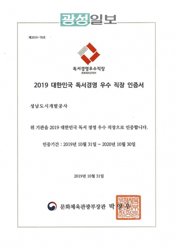 성남도시개발공사(사장 윤정수, 이하 공사)는 지난 10월 31일 열린 제6회 대한민국 독서경영 우수 직장 인증 및 시상식에서 ‘독서경영 우수 직장 인증’을 획득했다.