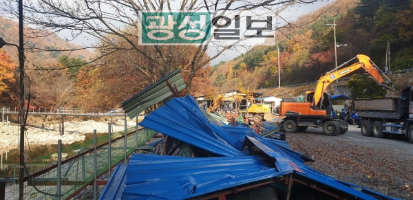 군은 이날 철거반원 20여명과 덤프트럭, 굴삭기 등 중장비 5대를 동원해 길이 35m 교량 1개소, 경량철골조 4동, 하천진입포장 계단 및 정문 1식 등 하천불법시설물을 강제 철거했다.특히 이날 철거과정에서 발생할 수 있는 만약에 사태에 대비해 경계 및 방호 인력 30여명과 경찰, 소방, 한전 등 3개 기관도 투입됐다.