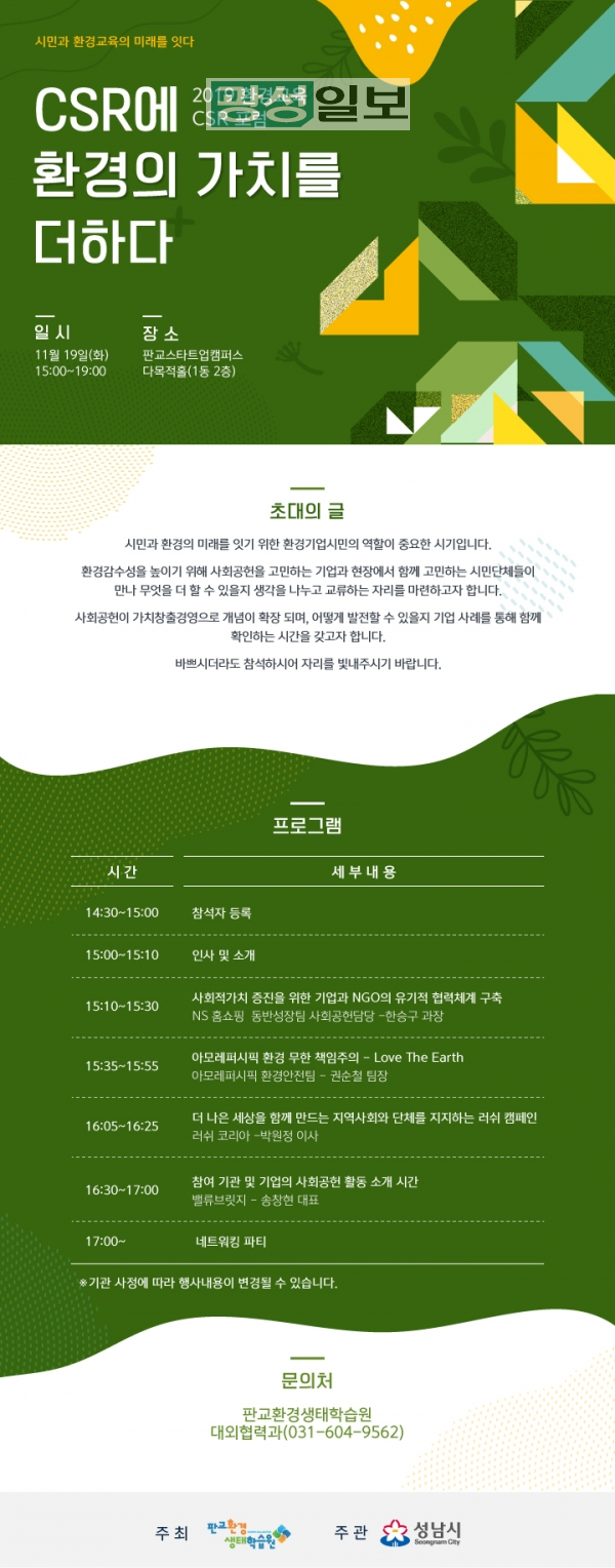 성남시 판교환경생태학습원은 11월 19일(화) 오후 3시부터 ~ 오후7시까지 판교 스타트업캠퍼스 다목적홀에서 「CSR에 환경의 가치를 더하다」라는 주제로 지난해에 이어 네 번째로 2019 환경교육 CSR 포럼을 개최한다.