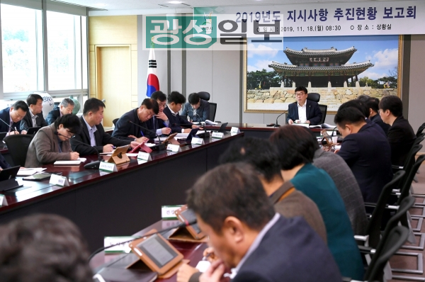 광주시는 18일 시청 상황실에서 신동헌 시장 주재로 간부공무원과 관련 부서장 등 40여명이 참석한 가운데 ‘2019년도 지시사항 추진현황 보고회’를 개최했다.