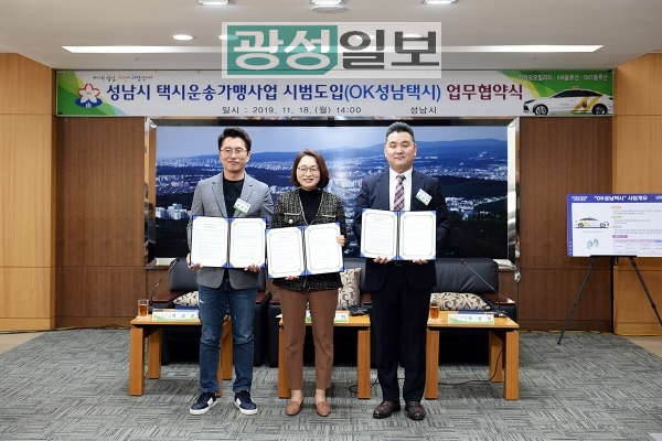 이를 위해 성남시는 모빌리티 플랫폼 운영사인 카카오모빌리티(공동대표 정주환·류긍선), 가맹 사업자인 KM 솔루션(대표 류긍선), 성남시 법인택시 10개사가 설립한 운송가맹점 사업자인 SNT 솔루션(대표 오성원)과 11월 18일 오후 2시 시청 9층 상황실에서 ‘OK 성남택시 시범 도입에 관한 협약’을 했다.
