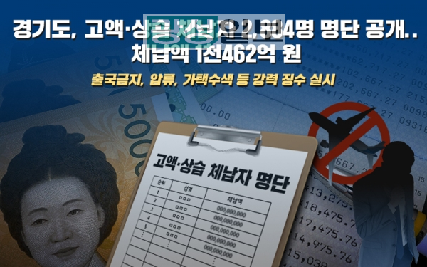 경기도가 1년이 지나도록 1,000만 원 이상의 세금을 내지 않은 고액·상습 체납자 2,884명의 명단을 20일 경기도 홈페이지와 경기도보, 위택스(지방세 납부 사이트)를 통해 공개했다.고 액·상습 체납자 명단에 게재된 이들은 개인 2,294명, 법인 590개로 체납액은 개인 1,054억 원, 법인 408억 원 등 총 1,462억 원의 세금을 체납했다.