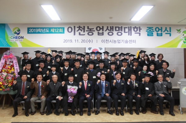 경기도 이천시(시장 엄태준)는 20일 농업기술센터 회의실에서 ‘2019학년도 제12회 이천농업생명대학 졸업식’을 가졌다.이날 졸업식에는 이천농업생명대학장인 엄태준 이천시장을 비롯해 졸업생 및 가족 등 130여명이 참석했으며 개회, 졸업영상 시청, 시상, 졸업증서 수여, 축사, 졸업소감, 기념촬영 등 순으로 진행되었다.