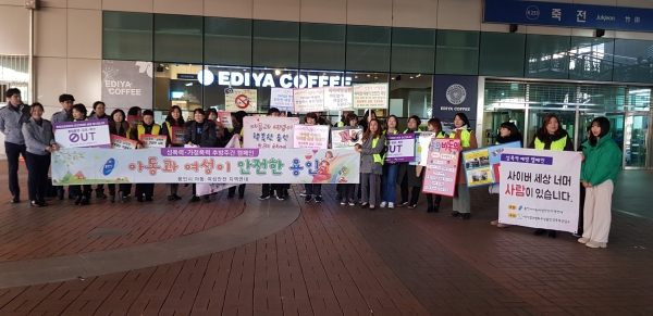 참가자들은 ‘폭력없는 세상 가꾸기 나로부터 시작됩니다’, ‘불법 영상 촬영‧유포‧확산 OUT! 보는 순간 당신도 공범입니다’등의 문구가 적힌 피켓을 들고 죽전역 일대에서 시민들에게 성폭력·가정폭력을 경각심을 알리는 전단을 배포했다.