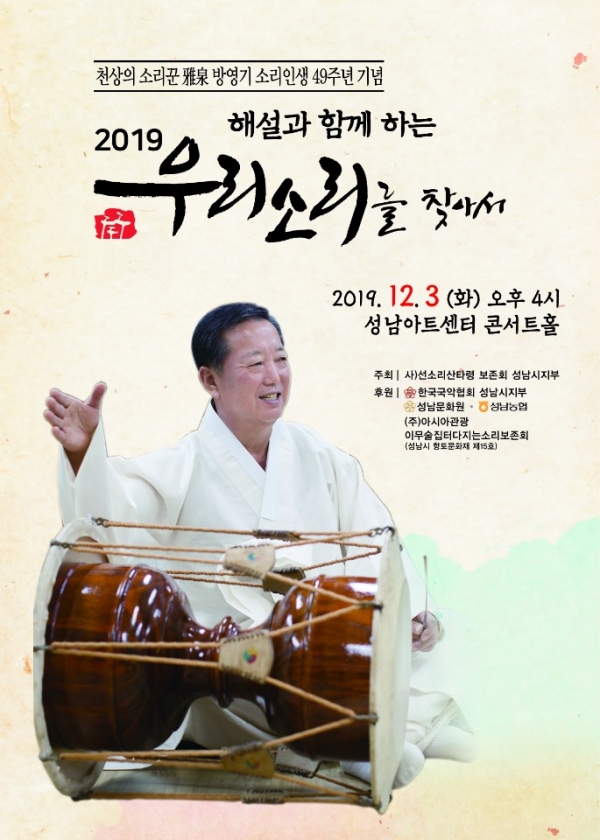 (사)선소리산타령보존회 성남시지부(지부장 방글) 주최, 성남문화원, 성남국악협회가 후원하는 ‘해설과 함께하는 2019 우리소리를 찾아서' 공연이, 12. 3(화)오후4시 성남아트센터 콘서트홀에서 열린다.